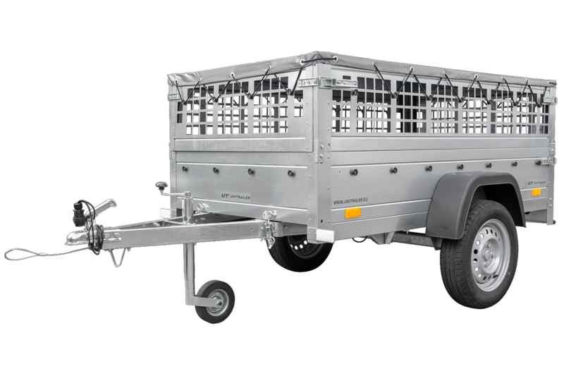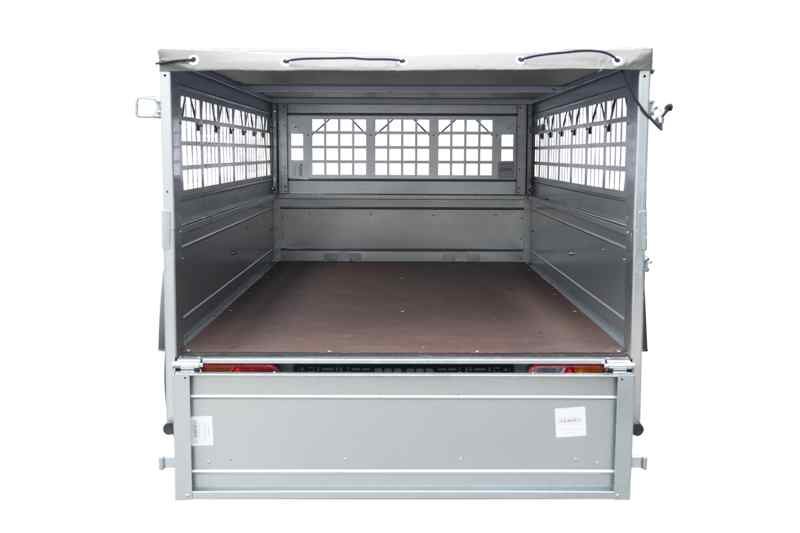 Remorque grillagée 200×106 UNITRAILER avec bâche plate grise, tiges de support bâche, ridelles grillagées et roue jockey – Garden Trailer 200 KIPP
