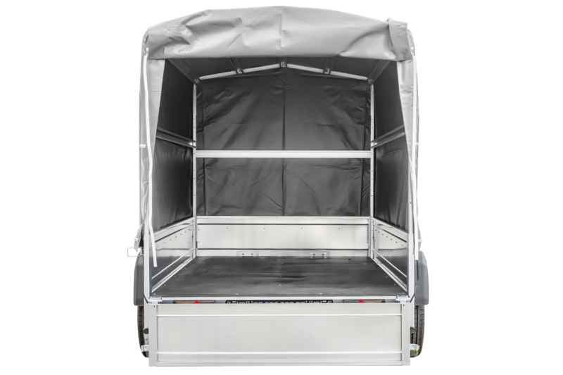 Remorque automobile avec bâche haute, arceau et roue jockey UNITRAILER Garden Trailer 230 KIPP est le dernier produit de notre offre. C’est la plus grande remorque dans notre magasin avec PTAC jusqu’à 750 kg. Elle est équipée de la ridelle arrière ouvrable, ce qui rend facile le chargement et le déchargement de la cargaison. Grâce au timon pliable, elle peut être placée verticalement sur le panneau arrière. Nous faisons toutes les formalités liées à l’achat pour vous. La remorque est livrée à votre domicile.