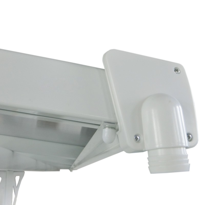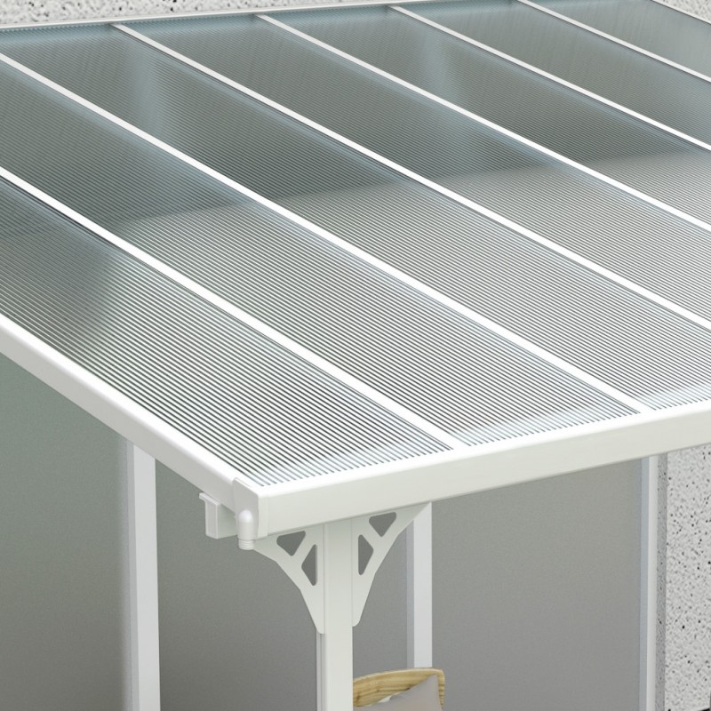 Les panneaux solides en polycarbonate alvéolaire transparent de 6mm bloqueront le rayonnement UV nocif, et ils garderont un aspect impeccable durablement. Ils ne craignent ni chocs, ni impacts, et un système intégré de gouttières à l’avant déviera la pluie sur les côtés, où des connecteurs d’angles peuvent se raccorder à des descentes d’eau, pour la récupérer ou la canaliser.