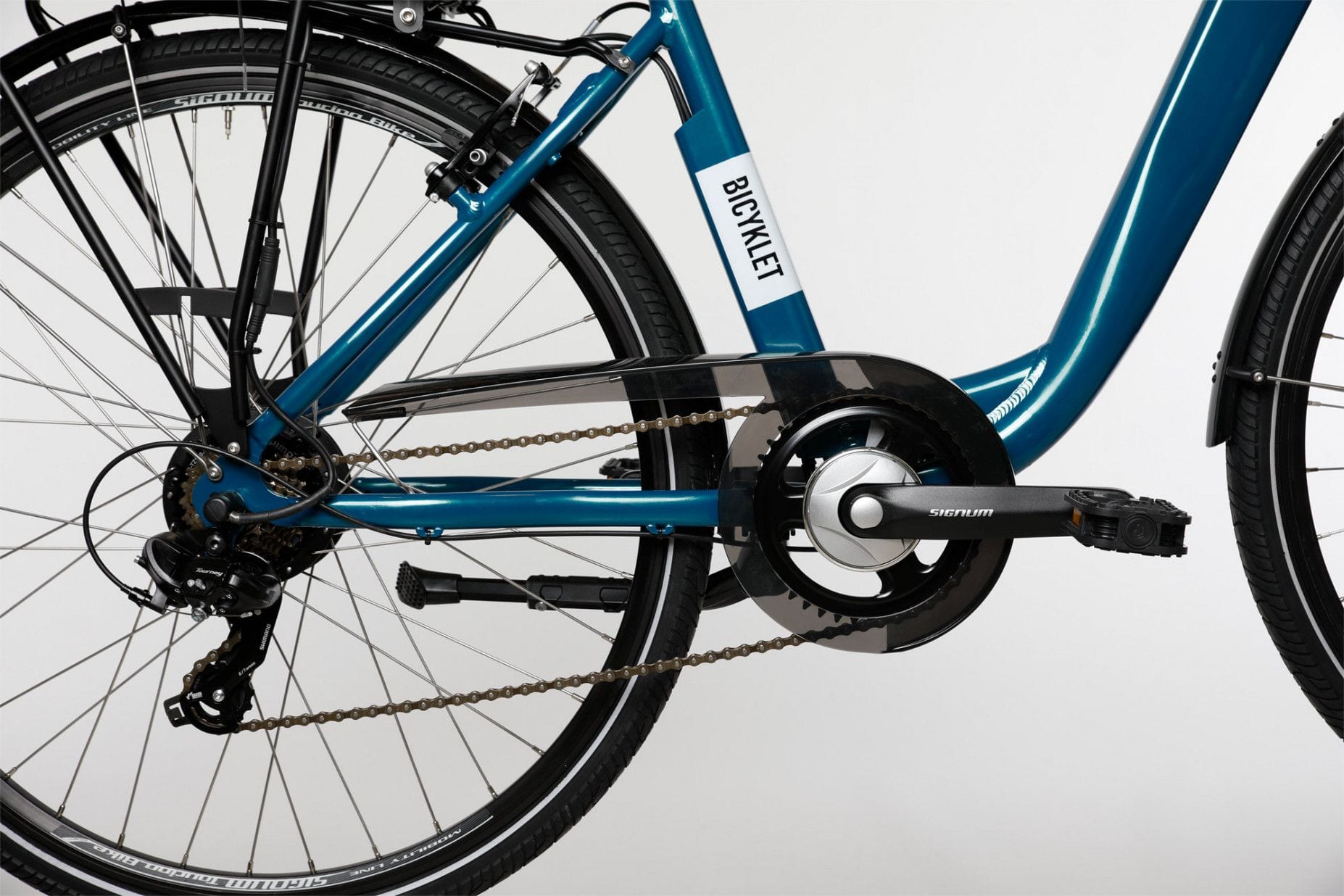 Le design du Bicyklet Claude ne passe pas inaperçu. Le cadre turquoise vibrant combiné aux accents marron en cuir confère à ce vélo une esthétique unique et attirante. Il incarne un équilibre parfait entre modernité et charme rétro, attirant les regards tout en offrant une expérience de conduite exceptionnelle. Les détails soigneusement conçus, tels que les garde-boue et les protège-chaînes, ajoutent à la fois style et fonctionnalité.